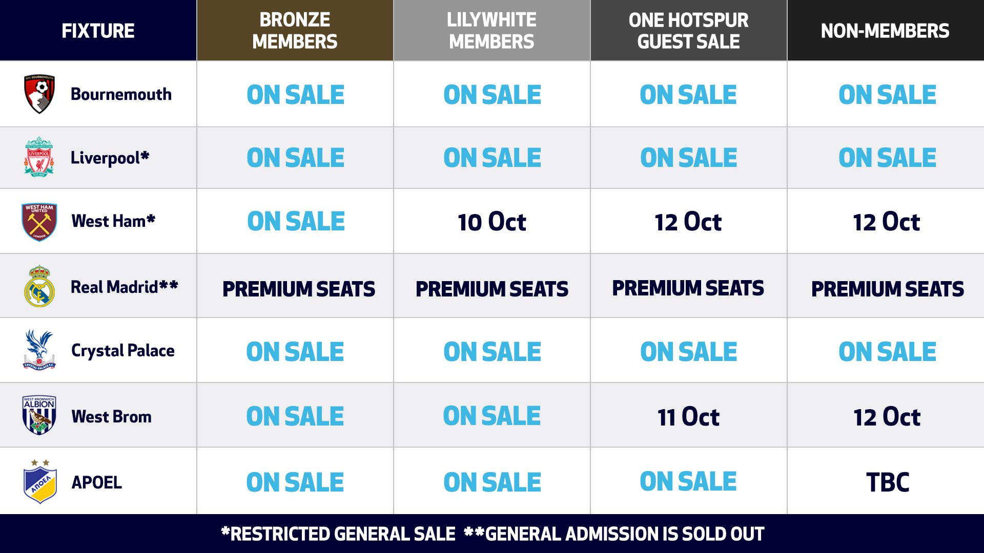 WEB Official Matchday Coach Travel Big Green Coach Official Seller of Spurs Home Tickets Latest information for all Home Fixtures including all of the on sale dates and. Find ticket information for Tottenham Hotspur FC matches along with hospitality and club membership details on the official website of the Premier League. If youre planning a trip to London and want to take in a Stadium Tour or purchase a Match Ticket please see below for more information. West Ham United vs Tottenham Hotspur. WEB Please see our new match ticket pricing for the 202324 season via the buttons below Category A x6 fixtures see prices here Category B x9 fixtures see prices here. WEB last updated 26 November 2023 Heres how to get Tottenham tickets if youre looking to get to London for a game at the Tottenham Hotspur Stadium any time soon. WEB Tottenham Hotspur Stadium 2022 2023 Match Ticket Prices Fulham Leicester City Everton Newcastle United Leeds United Aston Villa West Ham United Brighton Hove Albion Crystal. WEB Buying Tickets Guide and FAQs Tickets for Tottenham Hotspur games are released in dedicated sales windows throughout the year Becoming a One Hotspur Member gives you priority. WEB 100 Cheap Competitive Prices. WEB Purchasing Tickets Non-Members Ask Spurs How many tickets can non-Members buy Which games will reach General Sale. WEB The cost is 48 per membership With the fantastic history and large amount of fans tickets are always in high demand. WEB TicketSmarter has tickets available for all major matches on the current season schedule with prices ranging from 22000 to 232400 and an average price per game of 60530. View 202425 Season Ticket Pricing Map. Tottenham have confirmed season ticket prices ahead of the 202324 campaign Image. WEB As a result of the price rise the cheapest adult season ticket at Tottenham Hotspur Stadium is priced at 856 and the most expensive the 1882 season ticket comes in at 2367. Tottenham Hotspur Stadium London United Kingdom West Ham United vs Tottenham Hotspur. WEB As such we are announcing Season Ticket pricing today with renewals now open The deadline to complete payment and retain your seat for next season is 5pm on 20 May. WEB Category A varies from 66 to 99 for an adult category B from 38 to 5750 and category C from 27 to 40 Villa split ticket prices into two categories. WEB Earlier this month Tottenham announced a 6 increase in the price of its season tickets in a decision the clubs Supporters Trust called hugely disappointing. WEB The revenue from raising all season ticket prices by six per cent next season will make an extra 25million 32m to 3m per year Not nothing but not a lot in the context of a stadium. WEB Supporters wishing to purchase a Season Ticket from Tottenham Hotspur Stadium Limited on credit terms will be able to apply for a finance arrangement which spreads the cost of payment across a. WEB The Tottenham Hotspur Supporters Trust says it is hugely disappointed that season ticket prices will increase by 6 for the 2024-25 season Spurs are also removing the concession for new. WEB Buy tickets to Tottenham Hotspur vs AFC Bournemouth from safe secured marketplaces with 100 ticket guarantee. WEB On SeatPick ticket prices kick off at 113 while the average ticket price is currently 301 The fixture will take place on April 20 2024 at Tottenham Hotspur Stadium in the city of London. WEB Tottenham Hotspurs foreign fans have just as much right to attend games in person as local supporters manager Ange Postecoglou said amid a backlash over the Premier..